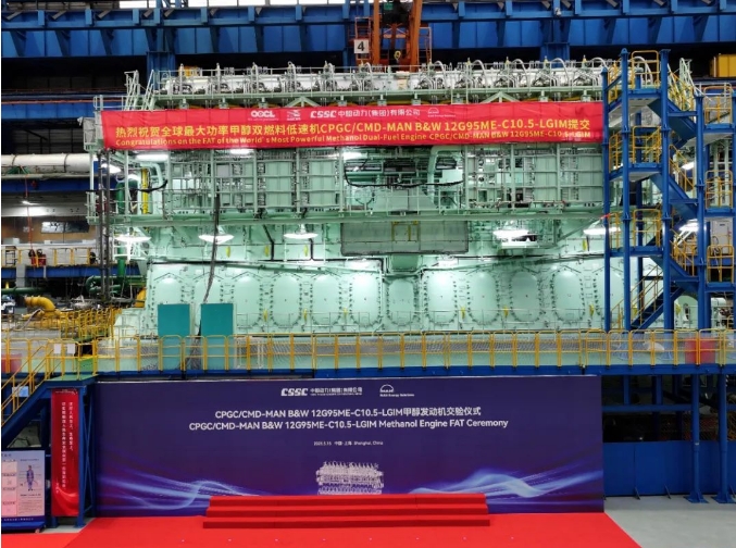 5月15日,中船集團旗下中船動(dòng)力與MAN ES聯(lián)合舉辦的CPGC/CMD-MAN B&W 12G95ME-C10.5-LGIM-EGRTC甲醇發(fā)動(dòng)機工廠(chǎng)驗收測試(FAT)交驗儀式在中船動(dòng)力下屬中船三井成功舉行。